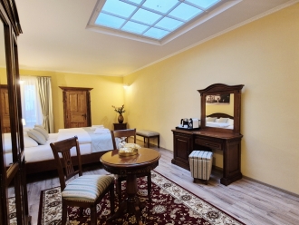 Užijte si pohodlí a romantiku stylového apartmánu s velkou manželskou postelí a luxusními zdravotními matracemi pro dokonalý odpočinek. Čeká vás příjemné posezení u stolku nebo v prostorném ušáku, ideálním pro relax s knihou či sklenkou vína.